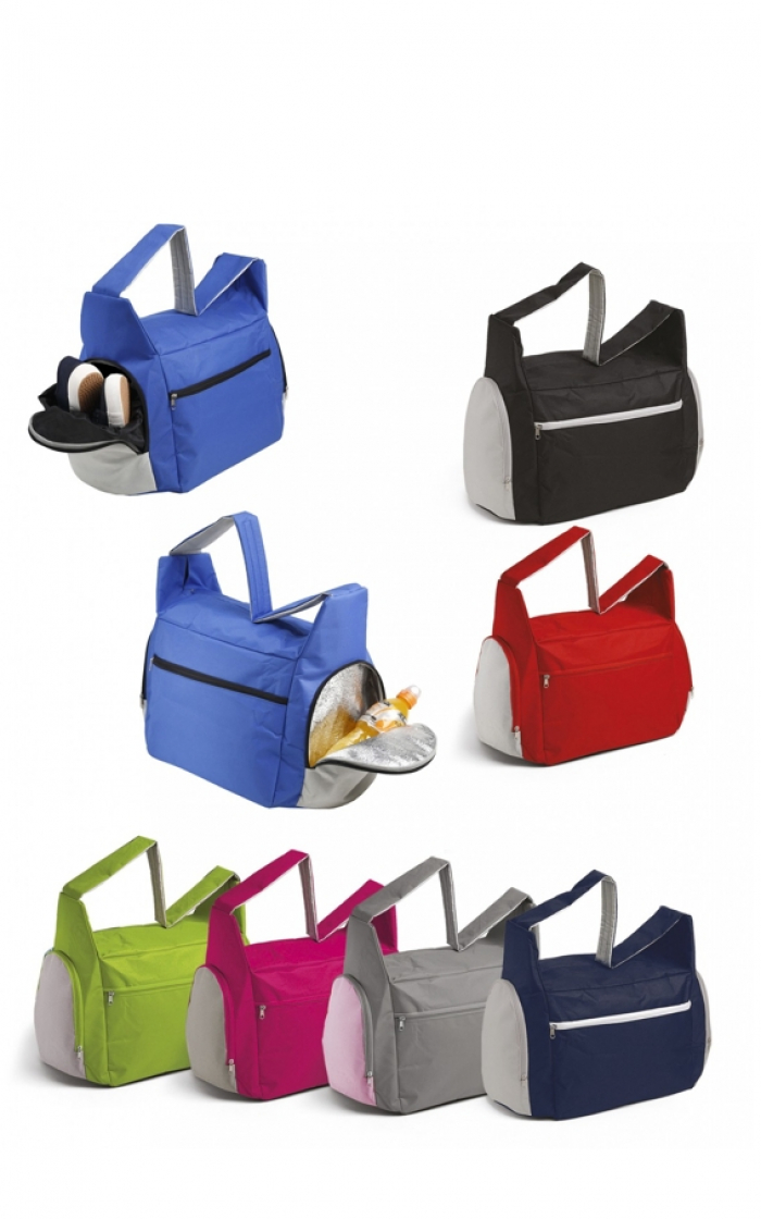 Borsa Palestra con vano scarpe. Prezzo 8,00 iva compresa.Tascone anteriore con zip.Doppie tasche laterali chiuse da zip: uso termico,uso porta scarpe.Manico a tracolla salva spalle.Interno plastificato. Dim 53*28*30 - Poliestere 600D.Disponibile in 7 colori .Confezione 20 pezzi