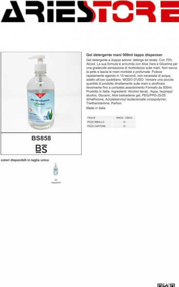 Gel detergente mani 500ml. Prezzo9,20 iva compresa. Gel detergente a doppia azione: deterge ed idrata. Con 70% Alcool. Made in Italy. La sua formula è arricchita con Aloe Vera e Glicerina per una gradevole sensazione di morbidezza sulle mani. Non secca la pelle e lascia le mani morbide e profumate. Pulisce rapidamente agendo in 15 secondi, non necessita di acqua, adatto all'uso quotidiano. MODO D'USO: Versare una piccola quantità di prodotto direttamente sulle mani e strofinare lievemente fino a completo assorbimento Formato da 125ml. Prodotto in Italia. Ingredienti: Alcohol denat., Aqua, Isopropyl alcohol, Glycerin, Aloe barbadenis gel, PEG/PPG-25/25 dimethicone, Acrylates/vinyl isodecanoate crosspolymer, Triethanolamine, Parfum.