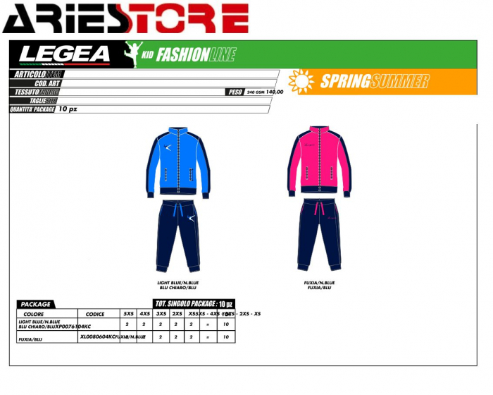 Aday tuta boy jr Legea Package. Prezzo 205,00 iva compresa. Package di 10 pezzi composto da 5XS/2- 4XS/2- 3XS/2 - 2XS/2 - XS/2.