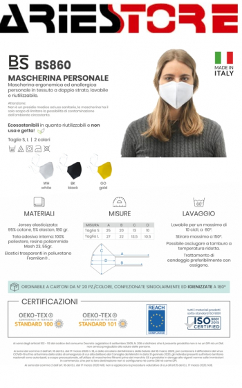 Mascherina BS860. Prezzo 5,10 iva compresa. Lotti da20 pezzi. Jersey elasticizzato 95% cotone, 5% elastane, doppio strato 180 grm2, tela adesiva interna 100% poliestere - resina poliammide mesh 23. Mascherina ergonomica di contenimento e protezione individuale con elastici di sostegno. Imbusto singolo non sterile, sanificato a vapore 180°. Non presidio medico. No DPI Lavare a 60° fino a 10 volte, stirare massimo a 150, possibile asciugare a tamburo a temperatura ridotta, trattamento di candeggio preferibilmente con ossigeno. Prodotto in Italia 180 g/m2