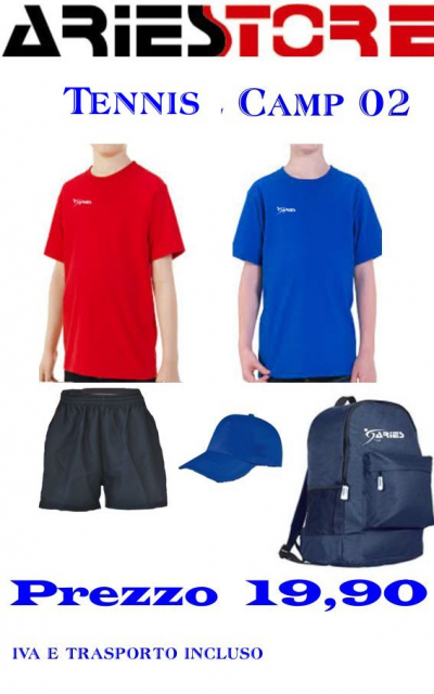 Aries Kit Tennis camp 02. Prezzo 19,9 iva e trasporto compresi. Disponibile dalla 4XS alla 4XL. Composto da: n° 2 T Shirt + Short + Zaino NY + Cap. MINIMO 30 PEZZI. TRASPORTO INCLUSO.