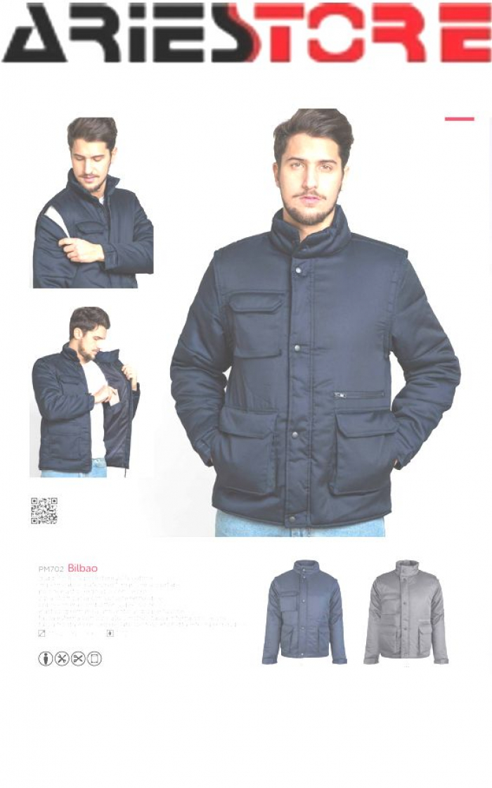 Giubotto Bilbao. Prezzo 23,40 iva inclusa. Minimo 10 pezzi. Giubbino impermeabile waterproof maniche asportabili polsini elastici regolabili con velcro zip a scomparsa con cursore removibile copricerniera con bottoni a pressione elastico giromanica antivento 2 doppie tasche tasca interna con velcro tasca esterna con zip (lato sinistro) tasca frontale con velcro (lato destro) 80% poliestere, 20% cotone Taglia: M - L - XL - XXL